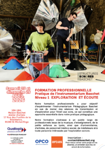 Bernard et François Baschet, pionniers de l’art sonore, ont conçu au sommet de leur œuvre un instrumentarium pédagogique adapté à tous les publics pour la pratique de l’improvisation sans apprentissage préalable du solfège, directement par l’improvisation et l’écoute. C’est un outil d’exploration de l’univers sonore, d’invention, de création individuelle et collective.